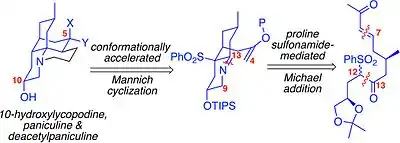 The first enantioselective synthesis of 10-hydroxylycopodine, deacetylpaniculine and paniculine was published by Mrinmoy Saha and Rich Carter in 2013. Two key ring-closure steps were accomplished by an organocatalytic Michael reaction and a Lewis acid-catalyzed Mannich reaction.[4] The impact of the C10 stereochemistry on the Michael addition to construct the C7–C12 bond and on the Mannich cyclization have been explored recently.[5]