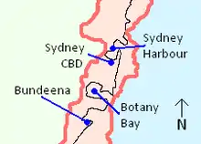 The storm cell formed at 4:25 pm AEST to the north of Nowra, roughly 115 km (71 mi) south-southwest of Sydney. After forming, it initially headed towards the coast in a northeasterly direction. The cell passed just to the west of Kiama at around 5:15 pm and gained a 'severe' classification from the Bureau of Meteorology at the same time.[15] 'Severe' is a classification used by the Bureau of Meteorology for thunderstorms which meet a specific criteria, namely producing hailstones with a diameter of 2 cm (0.8 in) or more, wind gusts of 90 km/h (56 mph) or greater and flash flooding, or tornadoes. This classification is also used by the Bureau to classify the attributes of a storm at any given time during its life.[7][16]