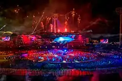 Carrara Stadium, located in the suburb of Carrara, was the main venue for Athletics, the Opening ceremony and the Closing ceremony. The seating capacity of the stadium was temporarily increased to 40,000 for the games by the installation of a large temporary North Stand.[28] The new Carrara Sports and Leisure Centre hosted the Badminton, Para Powerlifting, Weightlifting and Wrestling events.[29] The Carrara Indoor Sports Stadium hosted the back-of-house event operations.