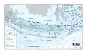 According to the Meteorology, Climatology, and Geophysical Agency (BMKG), the earthquake occurred at a depth of 11 km (7 mi), classifying it as a shallow event.[9] It had a strike-slip focal mechanism,[9] The United States Geological Survey (USGS) stated that the earthquake occurred as a result of strike-slip faulting within the crust of the Sunda Plate. Focal mechanisms indicate that the rupture occurred on either a steeply dipping north–striking, right-lateral strike-slip fault, or a steeply dipping east-striking left-lateral strike-slip fault. Its location is 260 km (160 mi) northeast of the subduction zone.[10]