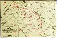 The Ottoman force defended 10–12 miles (16–19 km) of entrenched defences supported by well concealed and sighted guns.[29] The positions held by the force commanded by Kress von Kressenstein began on their right flank on the Mediterranean coast, which was strongly entrenched. Next, Gaza and the country to the east of the city was dominated by wired trenches situated on rising ground, while the line towards Beersheba was less strongly fortified.[36] The German and Ottoman forces' well-prepared positions emphasised "the advantages of defence by areas as opposed to linear defence, at least by day and in clear weather."[7] The well-sited redoubts covering wide gaps provided mutual support and facilitated a large reserve force outside the danger zone, which was available to take advantage of counterattack opportunities.[37] The defences at Atawineh, Sausage Ridge, Hareira, and Teiaha supported each other as they overlooked an almost flat plain, making any attack against them almost impossible.[38]