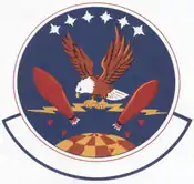 1. Approved 18 February 1952. Description: On a shield sky blue, between a cross red, edged white, in the two upper quarters, six bombs, points downward, three on either side of the cross, white, shaded blue, in the two lower quarters eight stars, four on each side of the cross, white, markings blue, in base over the cross a sphere white, markings blue, over the center of the cross a star white. thereover an eagle flying blue, markings white.