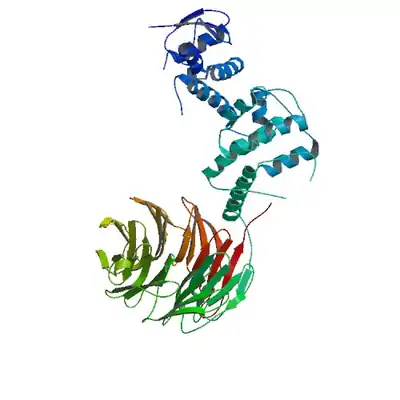 - ↑ Li D, Roberts R (2001). "WD-repeat proteins: structure characteristics, biological function, and their involvement in human diseases". Cell. Mol. Life Sci. 58 (14): 2085–97. doi:10.1007/PL00000838. PMID 11814058. S2CID 20646422.