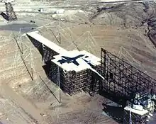 The primary wooden structure of trestle was built inside a natural depression spanning 600 feet across and 120 feet in depth, equivalent to a 12-story-tall building. A wooden ramp 400 feet long by 50 feet wide led to a test stand which itself measured 200 feet by 200 feet.[6] A total of 6.5 million board-feet of lumber were used to build the structure,[4] sufficient to support a fully loaded B-52 (then the largest and heaviest strategic bomber in the US inventory) while also minimizing any chance of interference from the ground or the structure itself, creating a reasonable simulation of airborne conditions. A mix of Douglas fir and Southern yellow pine were used for the timbers,[4] as both showed excellent EMP transparency with the former having the best tensile strength and the latter the best weather resistance. By using an all glued laminated timber structure and woodworking joints to mate the giant timbers, with the joints being held together with wooden bolts and nuts, measurements from the EMP tests would not be skewed by large amounts of ferrous material in the structure. Some metal was used in the construction as critically loaded joints incorporated a circular steel shear ring that surrounded the wooden bolt clamping the joint. Even the fire escape along one side of the trestle and the whole of the extensive fire suppression piping were constructed of fiberglass.