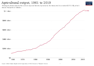 By 2015, the agricultural output of China was the largest in the world, followed by the European Union, India and the United States.[106] Economists measure the total factor productivity of agriculture, according to which agriculture in the United States is roughly 1.7 times more productive than it was in 1948.[107]