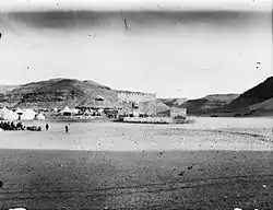 By 1907, the fort was being used as a telegraph station with three operators.[7] That year, French archaeologists A. Jaussen and R. Savignac carried out the first major excavation at al-Ukhaydir, producing photos, site plans and Arabic inscription squeezes.[7] They also identified an old mosque 400–500 meters north of the fort, which they claimed was the mosque Yaqut al-Hamawi associated with Muhammad centuries earlier.[7] At the time, local Arabs continued to inhabit the area, cultivating camel fodder and serving the garrison.[7]