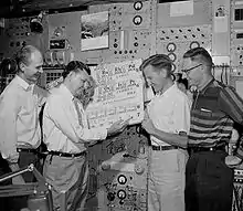 Ghiorso updates a periodic table in 1961 with the newly discovered element lawrencium while co-discoverers Robert Latimer, Torbjorn Sikkeland and Almon Larsh look on.