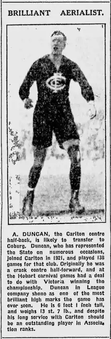 - ↑ Duncan had "received a very fine certificate, framed in oak, from the Carlton Foot ball Club for the fine services rendered that Club during the last four years" (Stratford, The Gippsland Times, (Thursday, 26 March 1925, p.3).