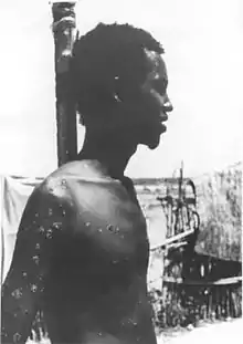 In August 1977, an outbreak developed in a Somalian nomadic group of twenty families; eight children developed symptoms in August to October.[10] On 12 October 1977, two children with smallpox symptoms were discovered at an encampment near the small inland settlement of Kurtunawarey, around 90 km (60 miles) from Merca. Local officials drove the children to Merca, where there was a nearby isolation camp.[10][13][18] Maalin, then aged 23, served as a guide to the party taking them in a closed Land Cruiser from the hospital where he worked either to the home of a surveillance supervisor or directly to the isolation camp. He is believed to have been infected during the journey, which lasted no more than 5–15 minutes.[10][13][15][17][18] One of the children, a six-year-old girl named Habiba Nur Ali, died two days later. She was the last person to die from naturally acquired smallpox.[10][13] The outbreak among the nomadic group was successfully contained by WHO workers by 18 October, but, critically, investigators failed to identify Maalin as a contact.[10][14][18]