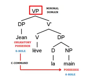 Inalienable possession constructions involve two nouns or nominals: the possessor and the possessee. Together, they form a unit, the determiner phrase (DP), in which the possessor nominal may occur either before the possessee (prenominal) or after its possessee (postnominal), depending on the language.[16] French, for example, can use a postnominal possessor (the possessor (of) Jean occurs after the possessee the arm):