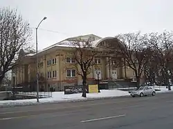 Plans for the tabernacle began soon after the formation of the Alpine Stake and drawings were made by the architectural design firm Liljenberg & Maeser.[2] Construction on the foundation began in 1909 and the cornerstone was dedicated in 1910 by Orson F. Whitney. The structure was completed in 1914 at a cost of $80,000 and dedicated the following year in 1915 by LDS Church President Joseph F. Smith.[3] The exterior is built with stone, red sandstone and yellow brick and does not feature a tower or steeple. The interior seats about 2,000 and retains much original decoration. Like many LDS tabernacles, it houses a grand pipe organ. It also was built with a baptismal font. The tabernacle was extensively remodeled at a cost of $230,000 in 1962 and rededicated by Henry D. Moyle.[4] It was remodeled again in 1982. In 1994, the tabernacle was closed for a period of time while renovations were undertaken, including an extensive asbestos abatement. The tabernacle was reopened in 1995 and continues to function as a tabernacle and hold various civic meetings.