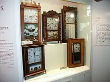 The exhibits include clocks (and some watches) from all periods and countries, but the focus of the exhibits is clearly on American clocks. A substantial part of the exhibit space is devoted to tell the story of Eli Terry and his successors and imitators.[2][3] Terry pioneered mass manufacturing techniques in the early 19th century by replacing the traditional system of making one clock at a time with handmade parts each adjusted to fit with each other, to using a system of machine-made interchangeable parts, with close enough tolerances that they could be assembled without further adjustment. Connecticut clockmaking, together with American firearm manufacturing, helped launch the Industrial Revolution.[4]