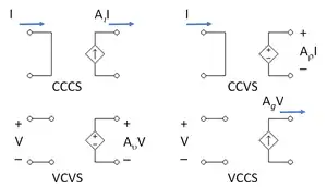 The input port can be idealized as either being a voltage input, which takes no current, with the output proportional to the voltage across the port; or a current input, with no voltage across it, in which the output is proportional to the current through the port. The output port can be idealized as being either a dependent voltage source, with zero source resistance and its output voltage dependent on the input; or a dependent current source, with infinite source resistance and the output current dependent on the input. Combinations of these choices lead to four types of ideal amplifiers.[5] In idealized form they are represented by each of the four types of dependent source used in linear analysis, as shown in the figure, namely: