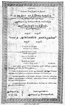On 9 February 1934, Mahatma Gandhi visited Andipatti, arriving by train at 5:30 PM from Theni.[1] At the Andipatti Railway Station, the villagers of Andipatti received him, along with a large crowd from the neighbouring villages like Muthukrishnapuram, S.S.Puram, Lakshmipuram, Jakkampatti. A wooden table was placed on the platform of the Andipatti Station and Gandhi used it as a dais to address the gathering;[2] a Welcome Address in Tamil printed on khadi cloth and wooden-framed was read out by Mr. P.C. Rajan and handed over to Gandhi, who was delighted to see it printed on his favourite khadi cloth. He wished to carry it with him on his tour, but realised that he could not carry it all through his journey. Hence with the permission of the villagers, he decided to auction the memento and use the fund for welfare scheme. P.C. Rajan was the successful bidder and he collected the souvenir from the hands of Gandhi. The piece was later on donated by Mr. Rajan to the authorities of the Gandhi Museum in Madurai in the 1960s.