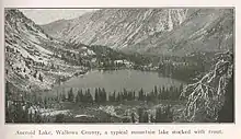 The first known name for the lake is believed to be Sterling Lake. In 1889 Tom Sterling with hired hand William H. Graves trailed a band of sheep through the Wallowa's to Baker, Oregon. They had camped at the lake several days during the trek and it was known unofficially as Sterling Lake for a time.[10] M. G. Royal, then president of the Weston Normal School,[11] had camped in the area on a lecturing visit in 1893 and made an excursion to the lake with his family. He was so impressed by the natural beauty of the lake he named it Anna Royal Lake after his mother, Mrs. Mary Anne (Stanley) Royal. This name was not recorded in any more official manner than the inscribing of it on the flattened side of a tree limb and hammered into the ground at the shore's edge.[10] Charles H.(Silver Tip) Seeber relocated to Wallowa county in 1889 from Walla Walla for health reasons. He held several patented mining claims in the area of the lake,[12] and lived there almost continuously for many years. He remembers the lake being called Anna Royal Lake when he first arrived there but also that it was changed over time to Aneroid Lake. [10]