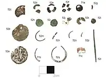 Brooches of the tenth and eleventh centuries are typically circular.[8] The most opulent brooches are silver, others are base metal. Small, round brooches, worn as cloak fasteners, are often depicted on men in late Anglo-Saxon art. Other brooch types which have been uncovered in late Anglo-Saxon burial finds are not seen in Anglo-Saxon art during this time period.[64]