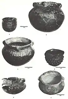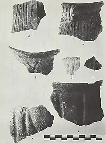 The 1958 excavations recovered 823 sherds, almost all of it Huber ware. Surfaces were primarily plain and decorated with medium- to wide-trailed lines on the shoulder area. Most of the lips were notched. Rarely, punctates accompanied the incised lines.[1]