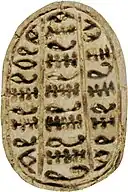 Anra scarabs are scarab seals dating to the Second Intermediate Period found in the Levant, Egypt and Nubia.[1] Anra scarabs are identified by an undeciphered and variable sequence of Egyptian hieroglyphs appearing on the base of the scarab which always include the symbols a, n and r.[2] As anra scarabs have overwhelmingly been found in Palestine (~80%), it has been suggested it was marketed by the contemporaneous 15th Dynasty for the Canaanites.[3]: 277