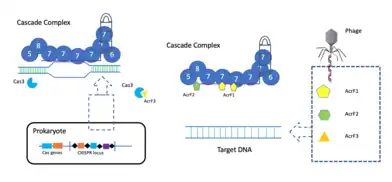 - ↑ Wang X, Yao D, Xu JG, Li AR, Xu J, Fu P, et al. (September 2016). "Structural basis of Cas3 inhibition by the bacteriophage protein AcrF3". Nature Structural & Molecular Biology. 23 (9): 868–70. doi:10.1038/nsmb.3269. PMID 27455460. S2CID 6466590.