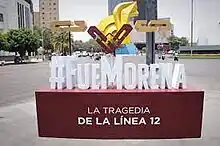 #FueMorena (lit. 'Was MORENA') was a temporary political stunt installed by members of the National Action Party (PAN) on the eve of the first anniversary of the Mexico City Metro overpass collapse, where 26 people died. It was installed in front of the Antimonumento +43 at the Esquina de la Información, where Paseo de la Reforma, Avenida Juárez and Avenida Bucareli converge. The politicians described it as an antimonumento and they blamed the National Regeneration Movement Party (MORENA) for the collapse and the lack of justice surrounding the investigations.[46]