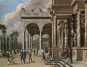 Luciano's work was originally very close to that of his presumed master Codazzi. This earned him the nickname 'Pseudo-Codazzi'.[7] There was a difference with Codazzi in that Luciano's works were more narrative and less dramatic.[8] Luciano was less concerned with accurate architectural rendering, in the tradition of quadratura. His interest lay in creating colourful effects.[2] While Luciano incorporated, like Codazzi, Bamboccianti genre elements of daily life, he softened the more realistic approach of the Bamboccianti and their indecorous aspects.[8] Luciano's style combined genre aspects with the elegance of Classicism, ennobled by sumptuous fancy architectures. His mature works anticipate 18th-century developments. It is these characteristics which attracted the attention of travellers on their Grand Tour, as it offered a mirror of the daily life in Rome while also expressing the monumentality of historic Rome.[8] Luciano also occasionally depicted in his architectural settings scenes from the Bible including The Massacre of the Innocents and Christ Expelling the Money-changers from the Temple.[2]