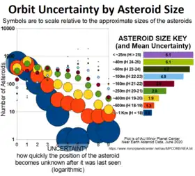 - for asteroids that will miss Earth this time round, the more accurate the orbit model is, the further into the future its position can be predicted. This allows recovery of the asteroid on its subsequent approaches, and impacts to be predicted years in advance.[14]