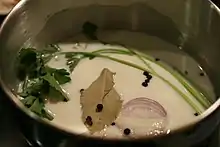 Milk infusing with bay leaf, peppercorns, shallot and flat-leaf parsley prior to being added to the roux