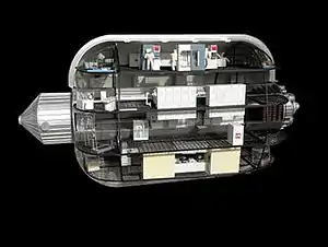The BA 2100, or Olympus,[3] is a conceptual inflatable space habitat[2] by Bigelow Aerospace. The larger BA 2100 would extend the volume and capabilities of the B330 module, which is under development as part of the Bigelow Commercial Space Station.[4] As with the B330 module, the number in the name refers to the number of cubic meters of space offered by the module when fully expanded in space (equivalent to 74,000 cubic feet).[5]