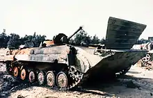 The BMP-1 is a Soviet amphibious tracked infantry fighting vehicle that has been in service from 1966 to the present. BMP stands for Boyevaya Mashina Pyekhoty 1 (Russian: Боевая Машина Пехоты 1; БМП-1), meaning "infantry fighting vehicle, 1st serial model".[11] The BMP-1 was the first mass-produced infantry fighting vehicle (IFV) of the Soviet Union.[8][12] It was called the M-1967, BMP and BMP-76PB by NATO before its correct designation was known.[13][14]