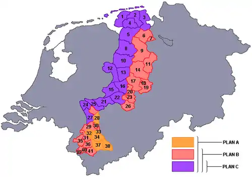 In the A Variation of the plan, among others the large cities of Aachen, Cologne, Münster, Oldenburg and Osnabrück were annexed. Bakker Schut called this the Weser border and ended his writings with the slogan Nederland's grens kome aan de Wezer (The border of the Netherlands be at the Weser). In a smaller plan B, the west-Rhineland cities Cologne, Mönchengladbach and Neuss were not annexed. In a third option, plan C, the proposed annexation was much smaller. It included an area west of Varel, the entire Emsland, and the area around Wesel until near the former Duchy of Cleves.