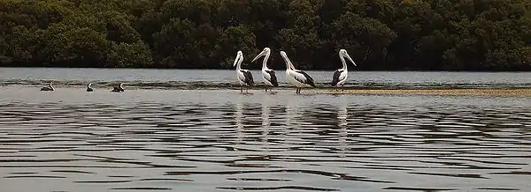 Over 70 species of fish have been recorded, along with over 110 of crustaceans and almost 50 of molluscs including species such as western king prawns, King George and yellowfin whiting and blue swimmer crabs.[7] Many bird species use the inlet including cormorants, terns, ducks, swans, pelicans, egrets and herons, as well as silver gulls and white-bellied sea eagles. Including migratory birds, over 250 species have been recorded in the inlet, surrounding wetlands and lagoons.[8]