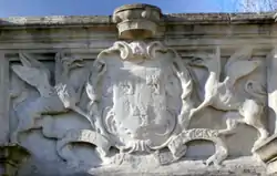 Heraldic achievement of George Granville, 1st Baron Lansdowne, detail from parapet of Queen Anne's Walk, Barnstaple, Devon, completed circa 1713. Motto of Granville, Baron Lansdowne: Deo, Patriae, Amicis ("For God, my Country and Friends"). The motto of his uncle John Granville, 1st Earl of Bath was: Futurum invisibile ("The future is unseen")[5]