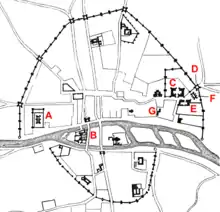 Garrisoned by a captain, a knight, eight squires and ten crossbowmen, the Bastille was encircled with ditches fed by the River Seine, and faced with stone.[12] The fortress had four sets of drawbridges, which allowed the Rue Saint-Antoine to pass eastwards through the Bastille's gates while giving easy access to the city walls on the north and south sides.[13] The Bastille overlooked the Saint-Antoine gate, which by 1380 was a strong, square building with turrets and protected by two drawbridges of its own.[14] Charles V chose to live close to the Bastille for his own safety and created a royal complex to the south of the fortress called the Hôtel Saint-Pol, stretching from the Porte Saint-Paul up to the Rue Saint-Antoine.[15][upper-alpha 2]