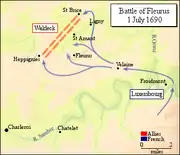 Unnoticed by Waldeck, Luxembourg had enveloped his flanks. Had the Allied commander realised that Luxembourg had split his army in two, he might have overwhelmed the isolated French left before the right came into position, but he did not.[2] After the French right wing was in position (commanded by Luxembourg himself), their artillery opened fire at about 10:00, striking the Allied infantry with great effect. The French left wing, commanded by Lieutenant-General Jean Christophe, comte de Gournay, opened their attack with a cavalry charge but Gournay was killed in the assault; his death disordered his cavalry which withdrew to Fleurus to regroup.[13][14]