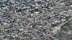 Ukraine reported on 3 May, that Russian aircraft bombed a grain elevator in Rubizhne. The grain elevator, owned by Golden AGRO LLC and opened in 2020 was completely destroyed.[37] Also, on 3 May, the village of Mykhailivka near Rubizhne was shelled, St. Elijah's Monastery Barbarian and rector of the church of St. Theodosius of Chernihiv in Mykhailivka, hieromonk Parthenius died.[38] On 4 May, Ukrainian forces claimed that Russian forces tried to take full control of Rubizhne without success.[39] It was reported that Russian forces seized Rubizhne and the nearby town of Voevodivka on 12 May 2022.[1] The BBC claims that during the fighting for Rubizhne up to 1500 shells per day were fired before Russian forces advanced.[40]