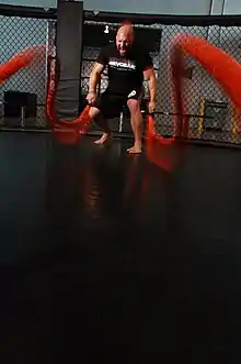 Battling ropes (also known as battle ropes or heavy ropes) are used for fitness training to increase full body strength and conditioning.[1] They were designed by John Brookfield in 2006, who developed the system around his backyard.[1][2] The battling rope can be alternatively used as a resistance training technique. After its development, he taught the system to Special Forces, the Cincinnati Bengals,[3] and the Olympic wrestling team.[2] Since then, the training system has increased in popularity and has expanded to mainstream gyms.[4]