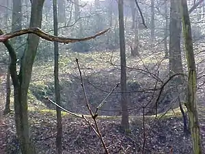Typically, no supports were used, and mining continued outwards until the cavity became too dangerous or collapsed at which point another mine was started, often in close proximity.[1] This type of mine was in use in prehistoric times, the Middle Ages,[3] and a few continued in use until the early 20th century in the region around Ford, Northumberland. Such pits are common at prehistoric flint working sites such as Grime's Graves in Norfolk and also in the coal mining areas of Yorkshire, the Forest of Dean,[4] and Leicestershire.[3]