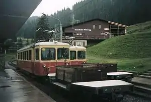 The Lauterbrunnen–Mürren Mountain Railway (German: Bergbahn Lauterbrunnen–Mürren, BLM, also known as Mürrenbahn) is a hybrid transport system in the Bernese Oberland area of Switzerland, which connects the villages of Lauterbrunnen and Mürren. The system consists of a connected aerial cableway, also known as the Grütschalpbahn, and an adhesion worked mountain railway. The cableway replaced a funicular, on the same route, in 2010.[1][2][3]