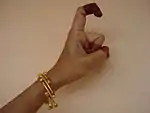 The gestures used in Bharatanatyam are called Hasta (or mudras). These symbols are of three types: asamyuta hastas (single hand gestures), samyuta hastas (two hand gestures), and nrtta hastas (dance hand gestures).[98] Like words in a glossary, these gestures are presented in the nritta as a list or embellishment to a prelim performance. In nritya stage of Bharatanatyam, these symbols set in a certain sequence become sentences with meaning, with emotions expressed through facial expressions and other aspects of abhinaya.[98] The basic standing position is called as Aramandi.