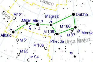 The Big Dipper (US, Canada) or the plough (UK, Ireland)[1][2] is a large asterism consisting of seven bright stars of the constellation Ursa Major;[3][4][5][6] six of them are of second magnitude and one, Megrez (δ), of third magnitude. Four define a "bowl" or "body" and three define a "handle" or "head". It is recognized as a distinct grouping in many cultures. The North Star (Polaris), the current northern pole star and the tip of the handle of the Little Dipper (Little Bear), can be located by extending an imaginary line through the front two stars of the asterism, Merak (β) and Dubhe (α). This makes it useful in celestial navigation.