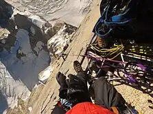 Big wall climbing is rock climbing on large routes that often take a full day, if not several days, of continuous climbing to ascend. Big wall climbing is a form of multi-pitch climbing but there is no definition of how many pitches are needed for a route to be a big wall ; a minimum of at least 6–10 pitches (or roughly 300–500 metres) is typically required. Big wall climbing is usually done in pairs as lead climbing, however, due to the length of the climbs, the second climber usually ascends via a fixed rope to save energy and time.[1][2]
