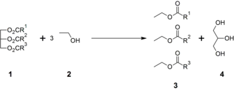 Triglycerides (1) are reacted with an alcohol such as ethanol (2) to give ethyl esters of fatty acids (3) and glycerol (4):
