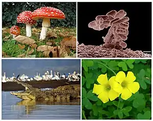 Fungi are eukaryotes that digest foods outside their bodies,[129] secreting digestive enzymes that break down large food molecules before absorbing them through their cell membranes. Many fungi are also saprobes, feeding on dead organic matter, making them important decomposers in ecological systems.[129]