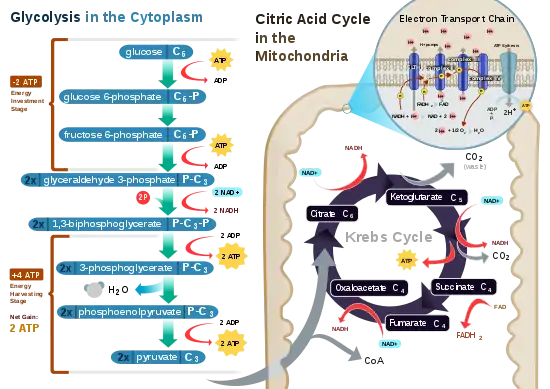 Sugar in the form of glucose is the main nutrient used by animal and plant cells in respiration. Cellular respiration involving oxygen is called aerobic respiration, which has four stages: glycolysis, citric acid cycle (or Krebs cycle), electron transport chain, and oxidative phosphorylation.[47] Glycolysis is a metabolic process that occurs in the cytoplasm whereby glucose is converted into two pyruvates, with two net molecules of ATP being produced at the same time.[47] Each pyruvate is then oxidized into acetyl-CoA by the pyruvate dehydrogenase complex, which also generates NADH and carbon dioxide. Acetyl-Coa enters the citric acid cycle, which takes places inside the mitochondrial matrix. At the end of the cycle, the total yield from 1 glucose (or 2 pyruvates) is 6 NADH, 2 FADH2, and 2 ATP molecules. Finally, the next stage is oxidative phosphorylation, which in eukaryotes, occurs in the mitochondrial cristae. Oxidative phosphorylation comprises the electron transport chain, which is a series of four protein complexes that transfer electrons from one complex to another, thereby releasing energy from NADH and FADH2 that is coupled to the pumping of protons (hydrogen ions) across the inner mitochondrial membrane (chemiosmosis), which generates a proton motive force.[47] Energy from the proton motive force drives the enzyme ATP synthase to synthesize more ATPs by phosphorylating ADPs. The transfer of electrons terminates with molecular oxygen being the final electron acceptor.