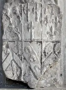Sir William Kirkham (died 1623), nephew, son of Richard Kirkham of Pinhoe in Devon by his wife Agnes Cape of Somerset.[11] He married (as his second wife) Mary Tichbourne (died 1627), a daughter of Peter Tichbourne of Hampshire[11] and a sister of Chidiock Tichbourne (1562-1586), a conspirator and poet. By Mary he had 8 sons and 4 daughters, the second son being Francis Kirkham who married the heiress of Roope of Bidwell, Newton St Cyres, and founded the line of Kirkham of Bidwell. His kneeling effigy, dressed in armour with neck-ruff and bareheaded, survives in the Kirkham Chantry, facing that of his wife.[26] Between the figures is a column on which is sculpted at top a sunburst inscribed with the letters "IHS" below which is inscribed "SPES ET" ("hope and"), below which is a crown, the browband of which is inscribed "CORONA" ("crown"), below which is a pair of hearts overlapping. At the base of the central column is a heraldic shield sculpted with six quarters, apparently not in its original position. The two outermost columns are each decorated with four heraldic shields, seven of which have been chiselled flat and unintelligible. The only arms still visible are on the top left shield, showing Kirkham impaling a field vair, but with the chief chiselled flat. On top of all three columns is a putto, with wings folded over his chest, but with face features chiselled away. The monument was "covered with plaster" until 1753, when on its removal the following inscription was revealed (since disappeared):[26]