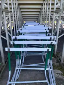 Bleachers (North American English), or stands, are raised, tiered rows of benches found at sports fields and other spectator events. Stairways provide access to the horizontal rows of seats, often with every other step gaining access to a row of benches.