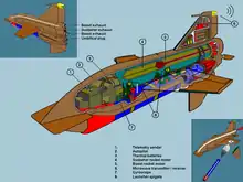 Ikara was powered by a two-stage in-line solid-fuel Murawa rocket engine developed by Bristol Aerojet Ltd in the UK[6][7] and was guided by radio command link until it reached the vicinity of the submarine, determined by the ship's sonar contact, where it would first jettison the rear ventral fin and torpedo rear covering and then release its 12.7 inch Mark 44 or Mark 46 acoustically-guided anti-submarine torpedo. The torpedo payload would descend by parachute while the missile itself was programmed to splashdown some distance away to avoid interference with the acoustic torpedo's seeker head. The torpedo would then begin a circular search pattern to find and lock onto a submarine contact.