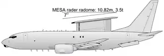 The 737 AEW&C is roughly similar to the 737-700ER. It uses the Northrop Grumman Electronic Systems Multi-role Electronically Scanned Array (MESA) radar. The electronically scanned AEW and surveillance radar is located on a dorsal fin on top of the fuselage, dubbed the "top hat", and is designed for minimal aerodynamic effect. The radar is capable of simultaneous air and sea search, fighter control and area search, with a maximum range of over 600 km (look-up mode). The MESA radar is fixed unlike the hydraulically-rotated AN/APY-1/2 of the E-3 Sentry, which the 737 AEW&C is set to replace.[6] Despite this, the radar is still able to offer 360-degree azimuth scan using two broadside (side-emitting) electronic manifold arrays, each covers two 120° sectors from starboard and port, and an end-fire array housed within the top hat that covers a 60° front and aft of the aircraft.[7][8]