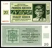 Czechoslovak banknotes for 1 koruna and 5 korun were stamped (and later printed) with "Protektorat Böhmen und Mähren" over "Protektorát Čechy a Morava," and subsequently issued in Bohemia and Moravia beginning on February 9, 1940.[8] These were followed by regular government issues of 1, 5, 50 and 100 korun in 1940,[9] 10 korun in 1942,[10] and 20 and 50 korun in 1944.[11] Nationalbank für Böhmen und Mähren in Prag (National Bank for Bohemia and Moravia in Prague) introduced 500 and 100 korun notes in 1942, followed in 1943 by overprinted Czechoslovak 5000 korun notes. In 1944, the National Bank issued regular 5000 korun notes.[11]