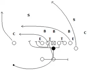 In American football, a bootleg play is a play in which the quarterback runs with the ball in the direction of either sideline behind the line of scrimmage. This can be accompanied by a play action, or fake hand off of the ball to a running back running the opposite direction.